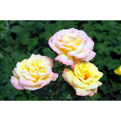 В высоту куст розы Глория Дей в среднем достигает 100-120 см, изредка 150 см. При этом в диаметре растение разрастается всего на 80-90 см. Кустик формируется прямостоячими побегами — прочными, толстыми и мощными ветками, которые редко покрыты крупными шипами. Именно благодаря небольшому количеству шипов эти цветы пользуются популярностью для срезки в букеты.